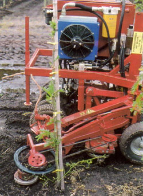 De Biowieder is dé oplossing om uw onkruid tussen bomen op mechanische wijze te verwijderen. Te plaatsen achter een tractor van 60pk. De werksnelheid is afhankelijk van de planten : kleine planten 4à5 km/u en in de grote laanbomen 6à7 km/u. Een wiel staat in verbinding met een sensor. De freeskop gaat door het wiel (wiel raakt boom) zo gestuurd worden dat deze op een vooraf ingestelde afstand van de boom blijft. De hoogte van het onkruid heeft weinig invloed op de werking van de biowieder.